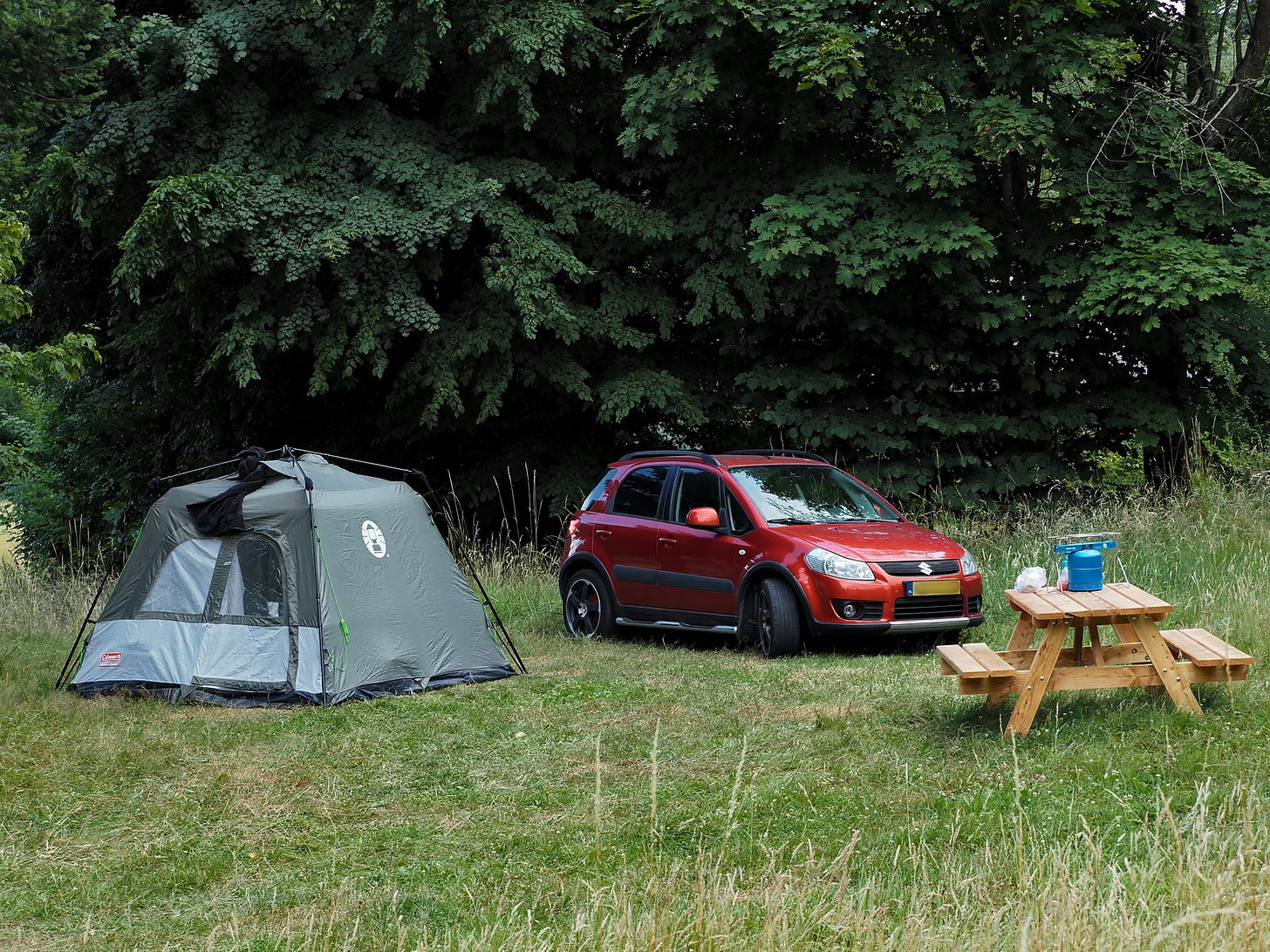 When I saw a man coming up from the grounds, that lie below the house’s level, I approached him and asked if he was André. He nodded, shook my hand and after I had asked the obvious questions, he walked me to a camp spot at the bottom of the grounds that had a wooden table and, although I didn’t directly notice it, electricity. My power cable is about 20 m long, just enough to cover the distance to the place where I wanted to place front of the tent, facing the rest of the camping. It was a spatial and quiet spot, surrounded by grasses and trees, as were most of the spots.